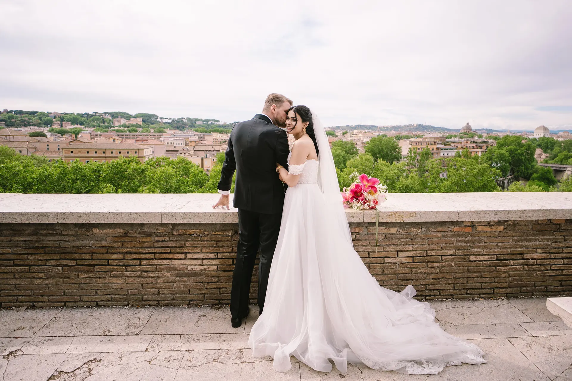 A groom in a white tux kisses his smiling bride's cheek, with the Roman Forum ruins blurred behind them.